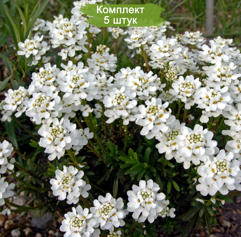 В комплекте 5 саженцев, готовых к высадке в открытый грунт. Превратите ваш сад в зимнюю сказку с иберисом вечнозеленым "Снежинка"!